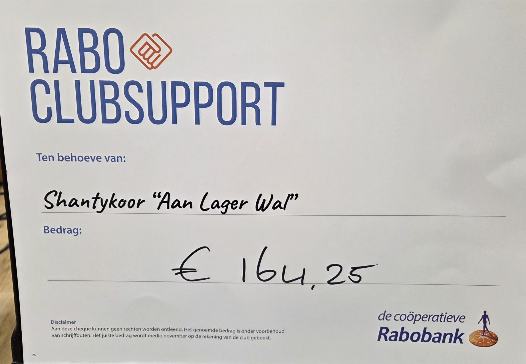 Leden van de Rabo hebben er samen voor gezorgd dat Aan Lager Wal een bedrag van €164,25 overhandigd kreeg uit handen van Rabobank-medewerkster Karin Jager. Het bedrag is het resultaat van de actie RABO Clubsupport.